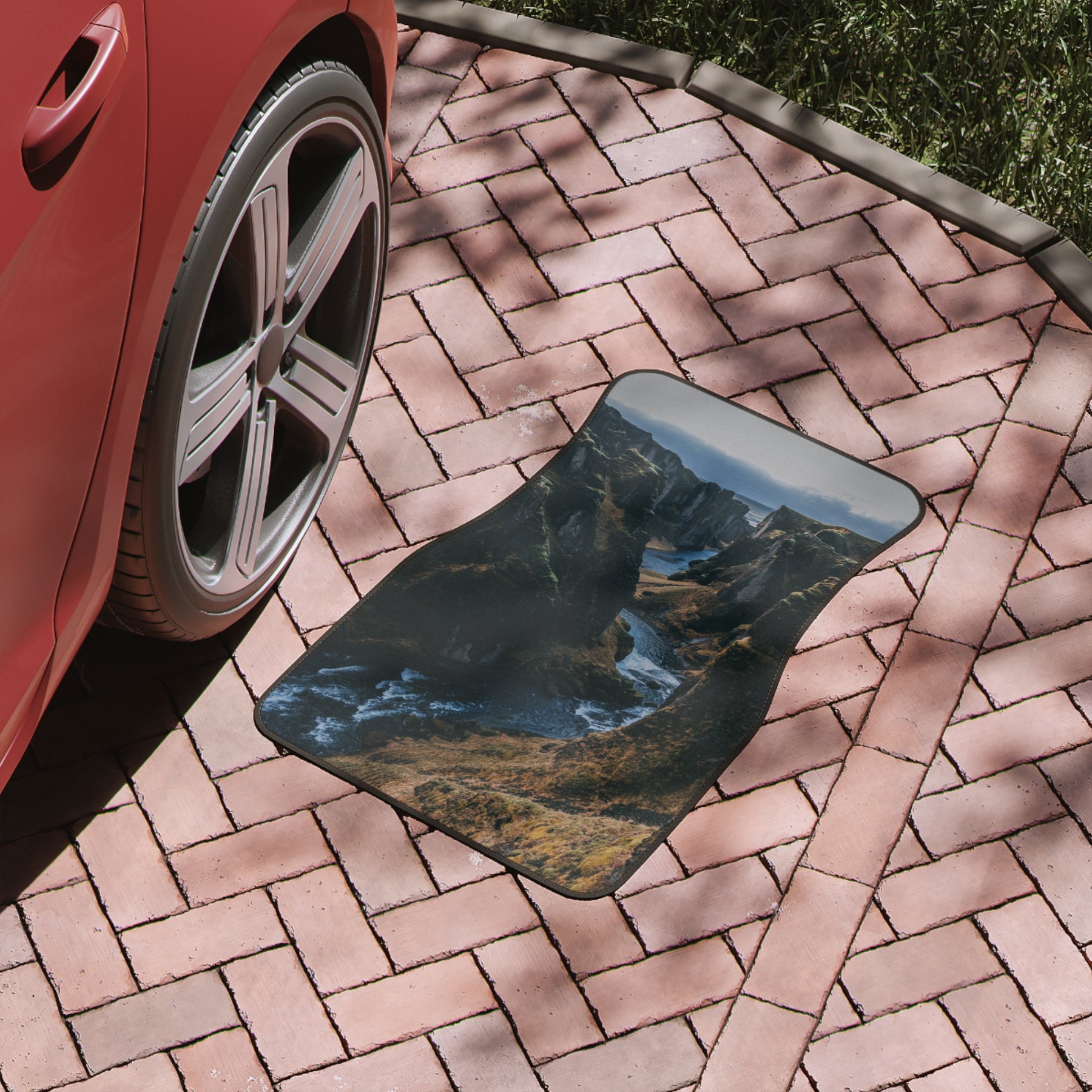 Bring a quiet, adventurous mood into your daily drive with these printed car floor mats. The design captures a misty canyon river winding through mossy cliffs — the kind of rugged landscape that invites slow mornings, long road trips, and headlights cutting through fog. The loop polyester face feels sturdy underfoot and holds color with depth, while the heavy rubber backing grips the floor so the mat stays put. Choose front or rear sizing to match your vehicle. These mats work well for drivers who favor natural, outdoorsy aesthetics and want their interior to reflect a love of exploration without shouting for attention. Small production quirks (a white underbase visible when bent, and slight print placement shifts) give each piece a subtly handmade character. Assembled in the USA from globally sourced parts.