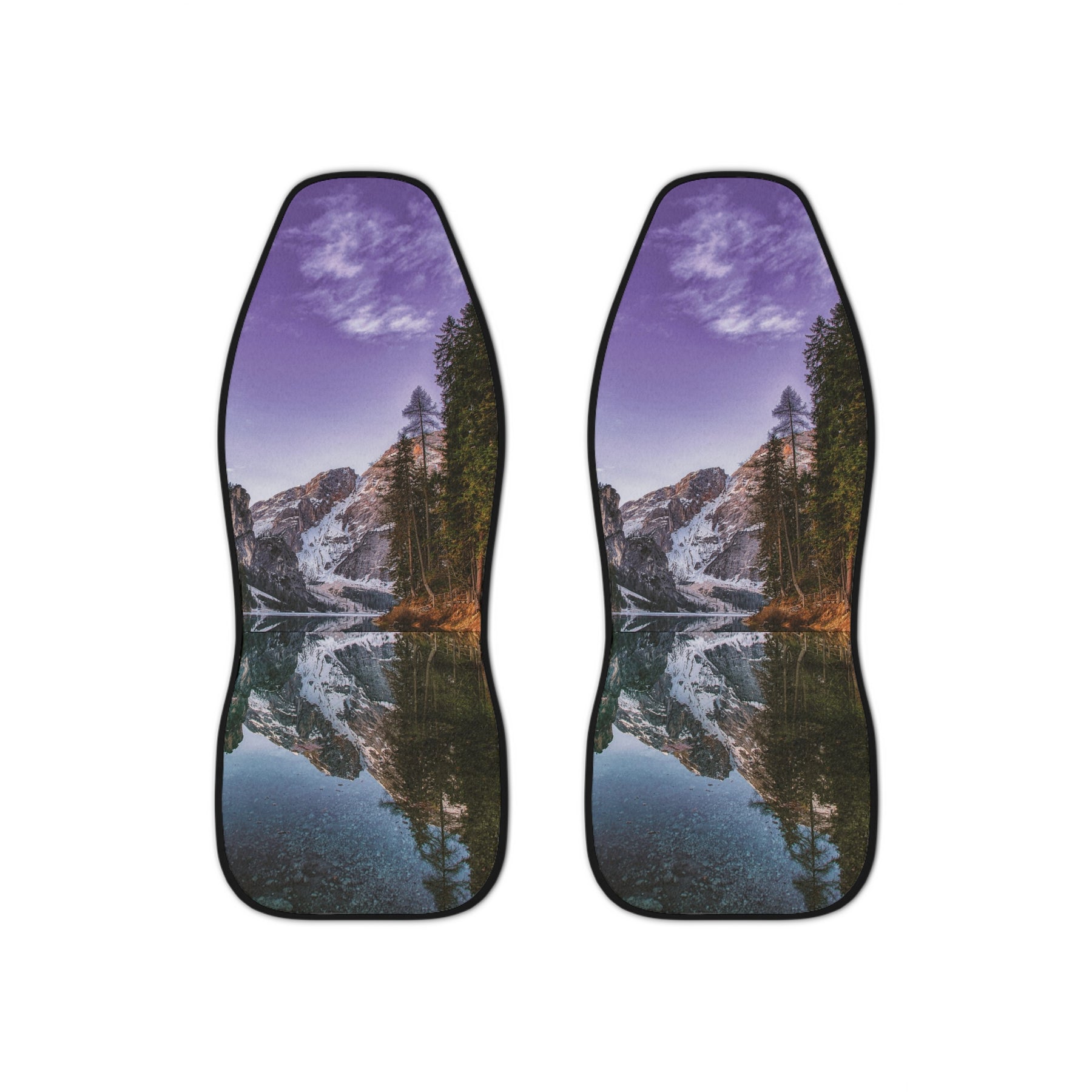 Bring a quiet, mountainside calm into every drive. These car seat covers feature a reflective alpine lake scene under a soft purple sky, turning your vehicle’s interior into a private escape. Thick, durable polyester resists spills and fading while the soft front keeps long drives comfortable. Installation is quick — elastic lining plus two hook straps lock the cover in place for a snug fit. Designed as a matching pair, the covers preserve the view on both front seats and add a cohesive, nature-inspired touch to your daily commute or weekend road trips. Note: do not use on seats with side airbags.